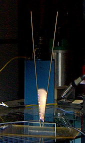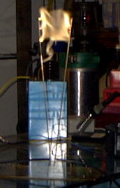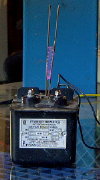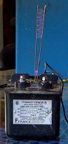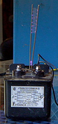 The picture below shows a OBIT powered JL. The rods are simply pieces of wire. If you look closely, you will notice that the rods are not quite centered between the terminals of the transformer because one rod has a longer "leg". This arrangement makes it easy to adjust the arc start point distance. This unit can be run for long periods, I have run it for an hour at a time.