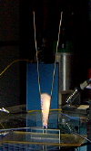 The JL shown below is powered by a 15kV, 120mA NST. The rods are 3/16" brass, around 14 inches long, and they are set a 5 degree angle, about 1/2" apart. The base is acrylic. This unit will not withstand continuous operation, as it gets quite hot and would melt the base. I limit runs to a few minutes, and the rods get sizzling hot.