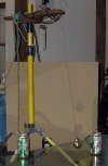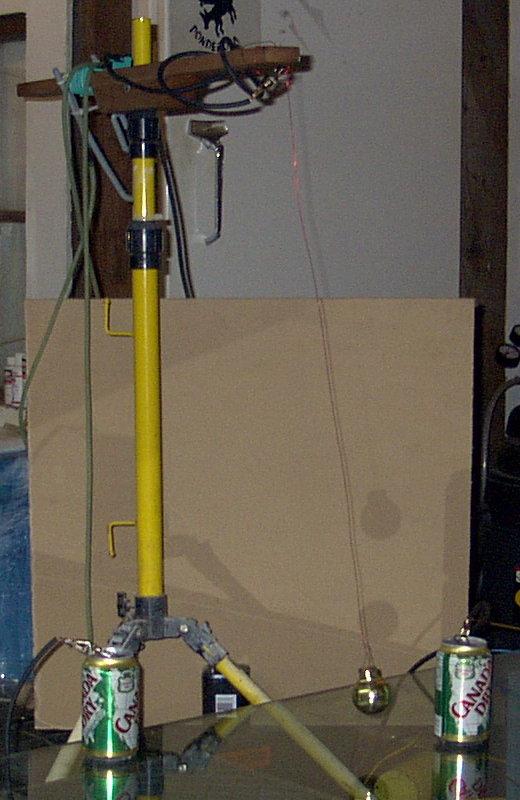 One side of the NST goes to BOTH of the soda cans. The other side goes to the wire suspending the ball. 30kV wire is used for these connections, and even so I don't count on it. Therefore I consider the stand to be "hot" during operation, even though it isn't. As you can see in the picture I am using a glass surface. Wood should not be considered unless it has been well dried and coated. Plastic is fine. Set the cans up so that they are inline with ball, about 16-18" apart. Distance here will of course vary with factors such as power supply and weight of ball.