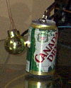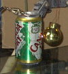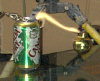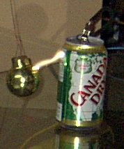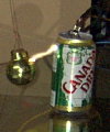 Using the chicken stick, set the pendulum in motion. It will take you a while at first to adjust the cans and so on, but once you get it going, it will keep going forever. As you can see, the arc created performs like a JACOB'S LADDER does. It is initiated quite close to the can, as in the first picture. As the pendulum is pushed away, the arc grows, and climbs up both the can and the ball. Finally it reaches the lid of the can and the neck of the doorknob.